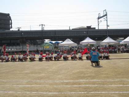 3年生は、綱引き。初めはよーいドンで一斉に引っ張りました。2回戦はみんなで走って行って、綱を持ったら一気に引っ張ります。そして最後は赤白二つに分かれて、半分の子どもたちが、トラックを半周まわってから、引っ張っている味方の応援をします。力勝負だけでない面白さがありました。