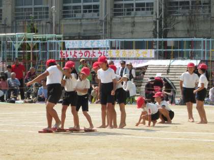 4年生は、3人で下駄をはいて、「イチ、ニッ、イチ、ニッ」と進みます。上手に進むチームもあれば、途中で止まってなかなか動けないチームもありました。練習ではうまくいったチームが進まなかったり、練習でじたばたしていたチームがスムースに進んだりとやってみるまで分からない面白さがありました。