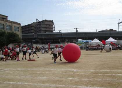 2年生は、大玉ころがしです。勢い余って観客席まで大玉を運びそうになるチームもあるなど、自分の背の高さくらいある大玉を力を合わせて運ぶ姿が、かわいらしかったです。