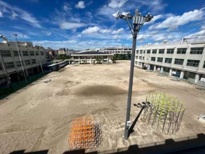 休業中に学校では、運動場が全面改修しました。2学期からは子どもたちが元気に運動することができます。また、南校舎の3Fに図工室と音楽室が完成しました。これで北校舎、東校舎、南校舎がつながり、校舎内の行き来もできるようになりました。