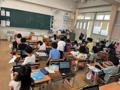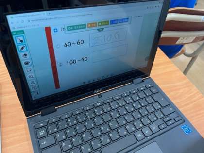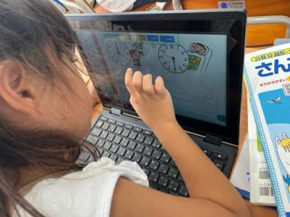 算数の学習では、ドリル学習の時間があります。早く課題を終えた子はタブレットで算数の自習をしています。1年生もタブレット内の学習ドリルに取り組みます。自分でログインして、問題を選び解いていきます。その場で答え合わせができるのがタブレットのいいところです。