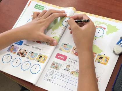 1日の流れを英語で確認したあと、その時に使う英語について子どもたちが発表していました。
