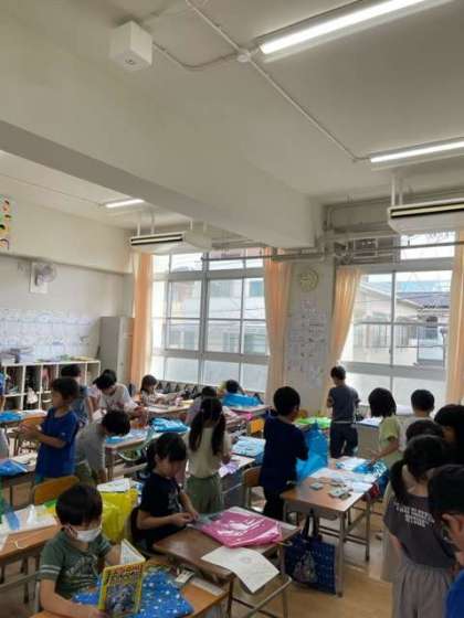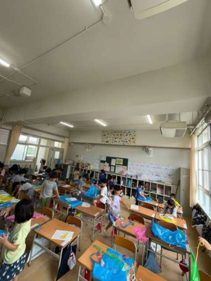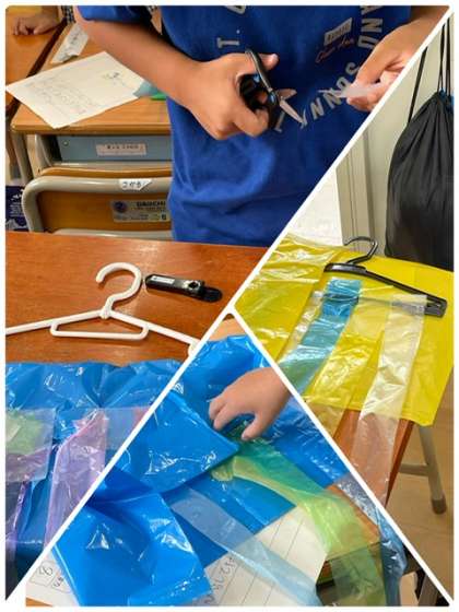 大きな色ビニールの材料やハンガーを利用して、風にゆれるものを思い思いに制作しています。