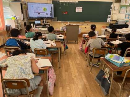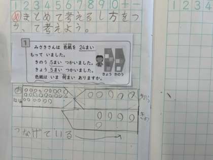 2年生はまとめて考える計算を学習しています。問題文を読んで自分で考え方をノートに書いていきます。図で考える子もいれば、式を書いて考える子もいます。それぞれの考え方を交流することで、同じ答えでもさまざまな考え方があることを学んでいます。