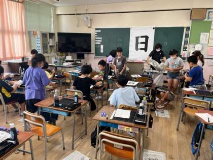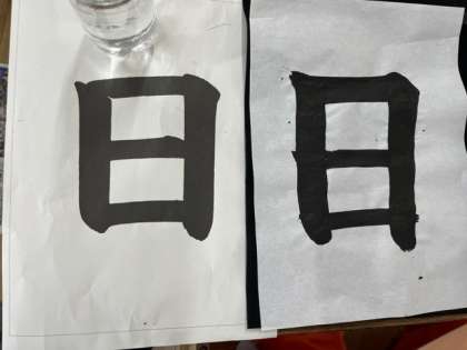 今日は、習字の学習です。毛筆で「日」という文字を書きました。お手本よく見て、力強く書いています。最後の片付けまで、墨をこぼさないように慎重に行なっています。