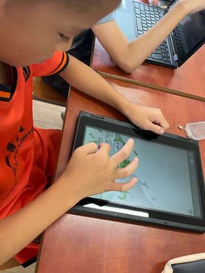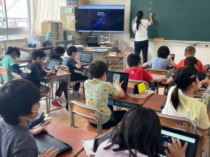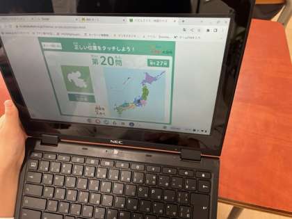 驚きの早さです!!4年生はタブレットでアプリを使って都道府県のクイズを行っています。初めは先生がチャレンジ。結果は5分。子どもたちは??早い子だと1分ほどで日本地図が完成します。ものすごいスピードです。