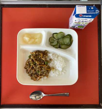 今日の大豆入りキーマカレーには新食品の豚レバーチップを使っています。