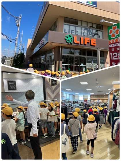 「店ではたらく人々のようす」を学習するために、ライフへ見学に行きました。バックヤード(魚、肉、野菜、果物、いろいろな品物の置き場、パン、惣菜、冷蔵庫、冷凍庫)や食品売り場を見学しました。