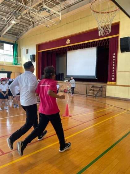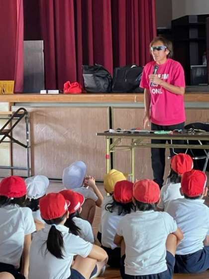 パラアスリートの高橋勇市さんをお迎えして、パラ陸上トライアスロンと向き合う高橋さんのお話を聞きました。実際にパラリンピックやアジア大会での金メダルや銀メダルにも触れることができました。アイマスクの体験もしました。