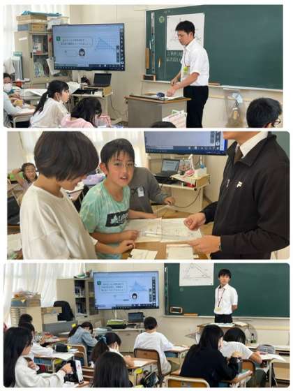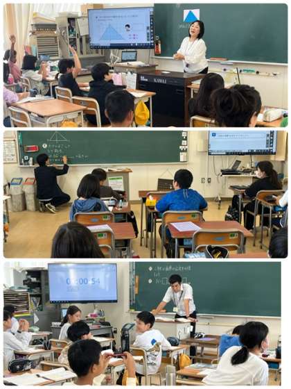 5年生は算数科の学習をしました。三角形の面積の求め方を考えました。図形を移動させながら面積を求めることができました。
