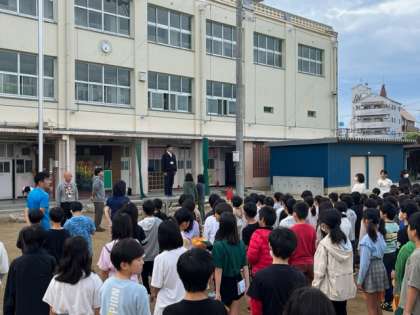 今日は運動場で全校朝会を行いました。校長先生のお話があり、言葉づかいについてのお話もありました。周りの人が嬉しくなる、温かい気持ちになる言葉もあれば、その逆もあります。みんなが安心して生活するためにはどのような言葉を使うとよいでしょう。児童会からは、そんな温かい言葉を紙に書いて、ありがとうの木を作りましょうと提案がありました。どんな手紙が届くか楽しみです。