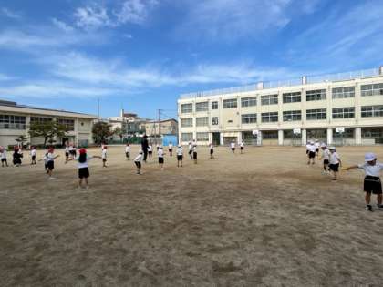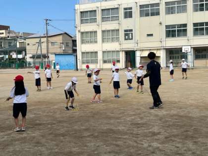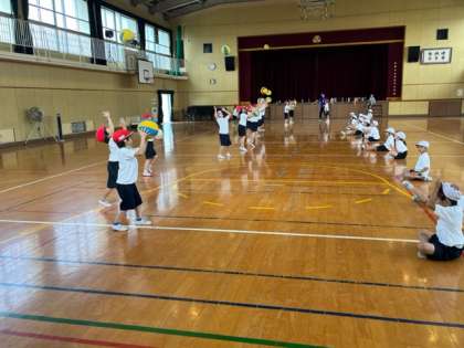一年生は縄跳びやボール運動をしています。短縄で前跳びの練習をしています。上手にとべるかなぁ。体育館ではボール運動をしています。楽しく元気に運動に親しんでほしいです。
