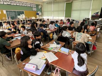 3年生は社会見学で行ったお店で教えてもらったことをまとめています。働く方々から教えていただいた事をグループでまとめて交流しています。商店街には色々なお店があり、見学が楽しかった様子が伝わります。