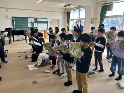 2年生は「山のポルカ」という曲を学習しています。民俗舞曲なので、リズムよく踊り出したくなるのようなテンポのいい曲です。実際に踊っている動画を見せてもらうと、思わず体が動き出す子どもたち。とっても可愛いです。