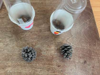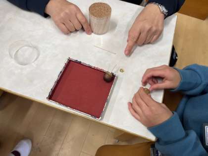 1年生はどんぐりや松ぼっくりを使って工作しています。マラカスを作ったり、コマを作ったりとても楽しそうです。まとあてを作っている子もいます。自分で作ったものを周りのみんなにも試してもらっています。