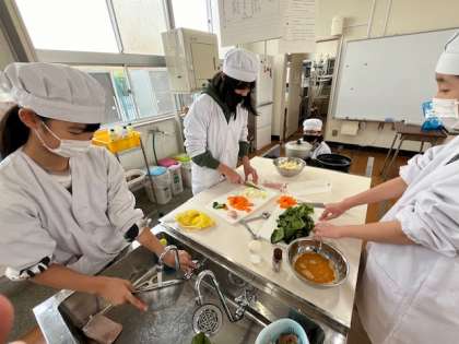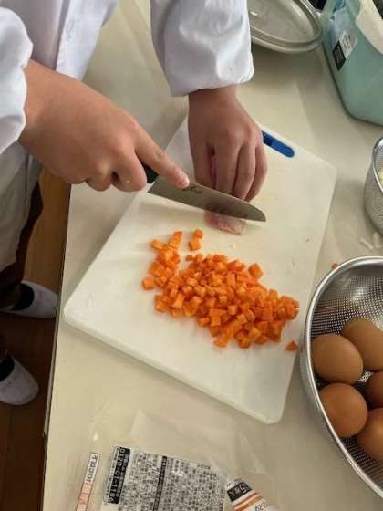 今日は調理実習の日です。人数分の材料を量って調理スタートです。さすが6年生、包丁も上手に使い具材を切っていました。ゆでたり、焼いたりするのも上手くできたようです。みんなで美味しくいただきま〜す。