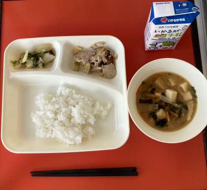今日の給食では地産地消の一つとして、大阪で作られたきくなを使っています。