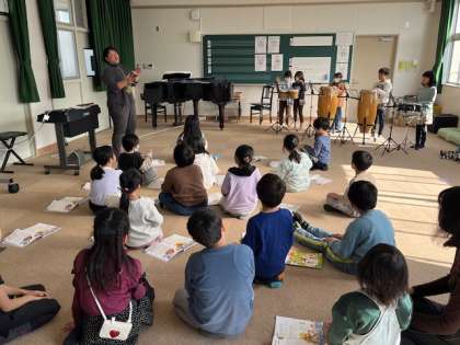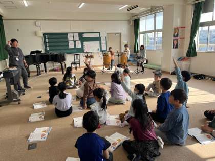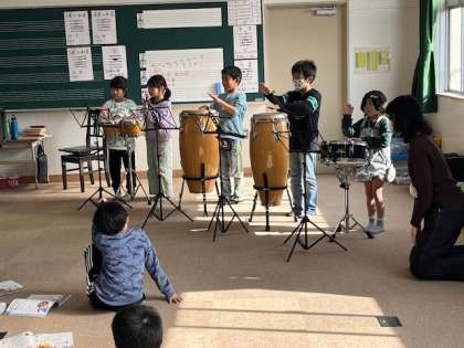 2年生は打楽器を使ってリズムの学習です。太鼓を使って「ドンドン」「ドンドコ」とリズムを打ちます。何度も繰り返し打つことでリズムがそろってきました。