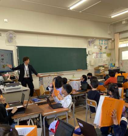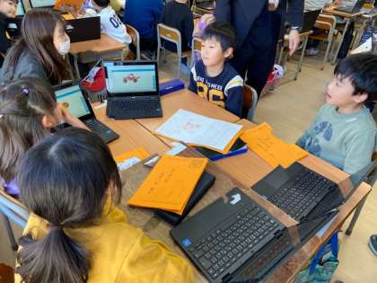 話を楽しくつなぐにはどうしたらよいか考えました。グループで自分で作成した形について伝え合います。発表者に共感したり質問したりし、友だちの発言を受けて楽しくつなぐ対話を大切にしながら取り組むことができました。