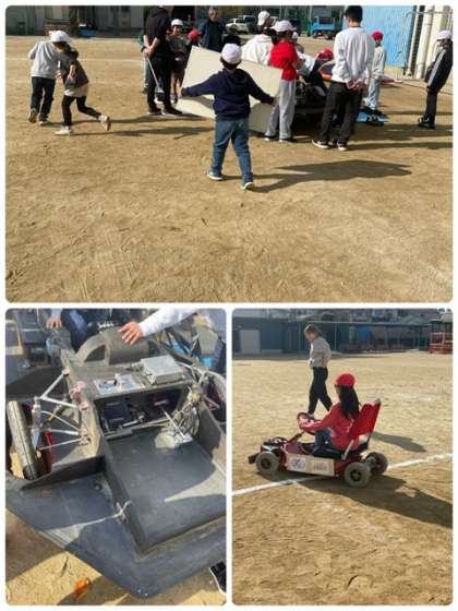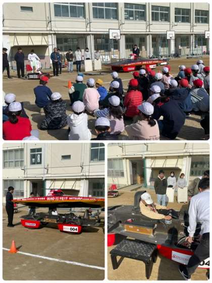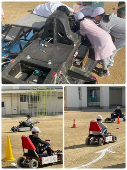 ソーラーカーの出前授業で大学から来ていただきました。太陽光発電やエネルギーの学習をしました。ソーラーを使った車にも乗る体験をしました。