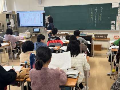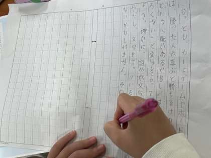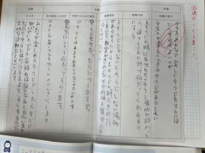 5年生の国語科は反対意見に対する文章を書く学習です。予想される反対意見をあげ、それに対して自分の意見を書き説明する学習です。構成メモにテーマや予想される反論などをまとめ、文章にしています。相手の意見を受け入れながら、自分の意見を正しく伝え、合意していくことは日常の生活でもとても大切なことです。