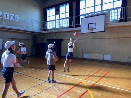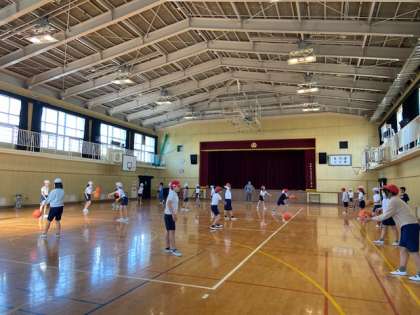 バスケットボールのゲームに向けて、グループで基本的な練習をしています。シュートを打つ練習ではどの場所から打てば入りやすくなるのかなど、声をかけ合いながら全員がゴールを決めることができました。