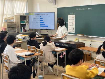 5年生は栄養教諭の先生と朝ごはんについての学習をしました。家ではどのように朝食をとっているでしょうか?朝ごはんを食べることで体・脳・おなかのスイッチを入れて1日元気に活動できることを改めて学びました。毎日しっかり朝ごはんを食べましょう。
