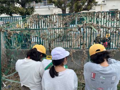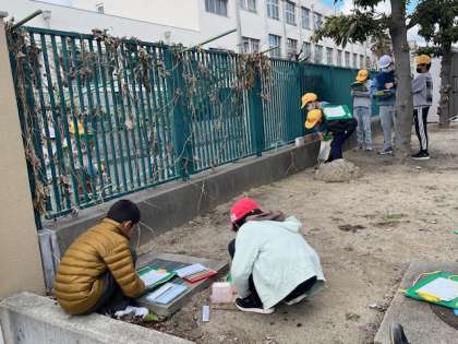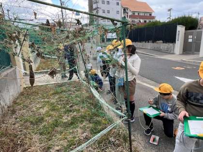 4年生は冬の植物の観察へ行きました。育てていたヘチマの実の中には種子ができていて、子どもたちも見たり触ったりして観察しました。「この種植えたら、来年もできるやん」と意欲的に観察していました。
