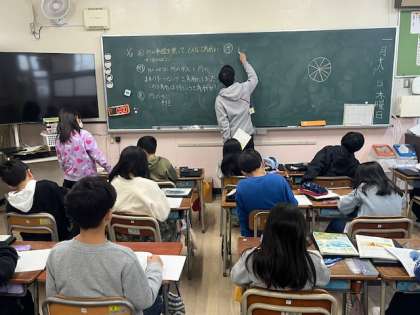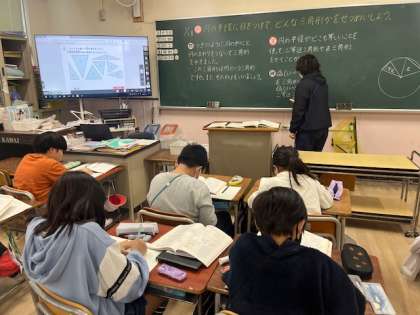 3年生の算数は図形の学習です。円の半径を使って三角形を作る学習です。二等辺三角形や正三角形となる理由を自分の言葉で説明していました。作図も上手くできたでしょうか。
