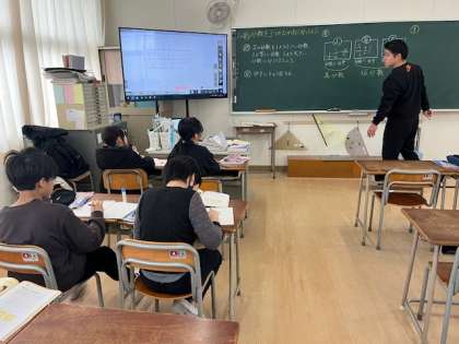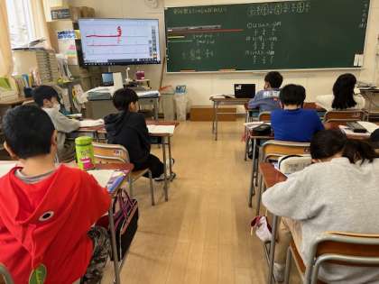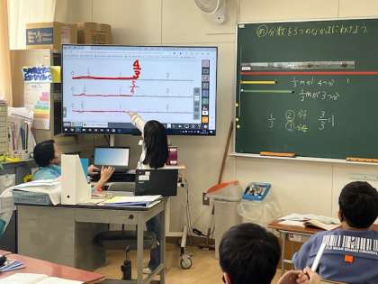 4年生の算数は分数の大きさについて学習しています。分数なのに1よりも大きな数がある事に驚きながら、数直線を使って数の大きさをまとめました。先生もテープを使ったり、モニターで可視化したり一生けんめい教えています。