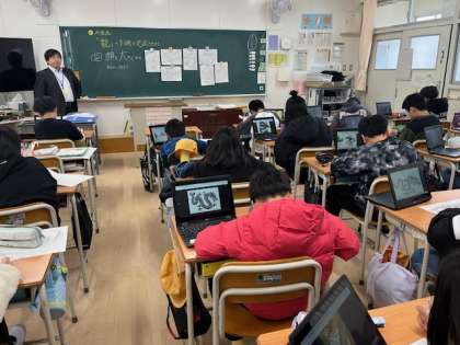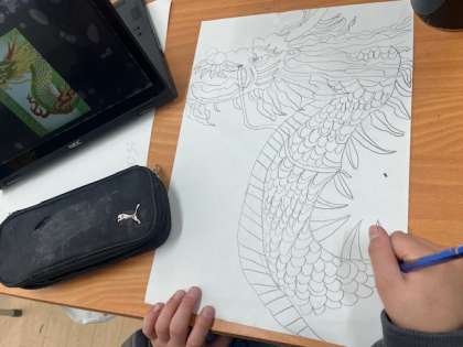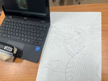 5年生は版画の下絵で龍の絵を描いています。辰年という事で、タブレットで調べた龍を紙に描いています。かっこいい龍の絵がたくさん出来上がっています。彫刻刀で彫って、版画にするとどんな作品が出来上がるでしょうか。とても楽しみです。