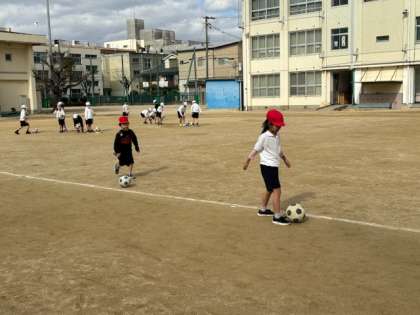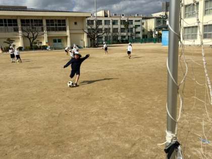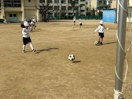1年生は運動場でサッカーです。今日はゴールに向かってドリブルしシュートの練習を繰り返していました。上手くゴールに入らなくても、走ってボールを追いかけます。これだけ動いていれば寒さもへっちゃら?強くシュートすることができていました。