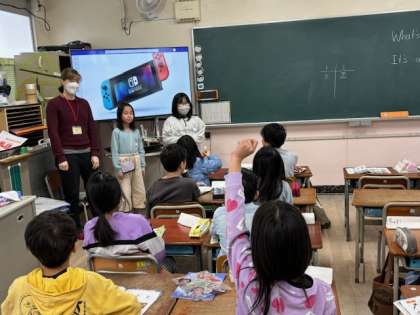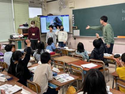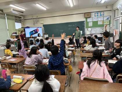 3年生は英語の先生とクイズをして楽しく学習しました。今日はモニターに映されたものを、みんながヒントを出して、何か当てるゲームです。色や形、大きさ、何に使うかなど、英語でヒントを出しています。何問正解できたかなぁ??