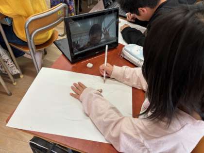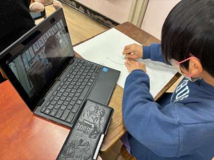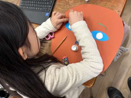 3年生は自分の顔を紙版画で表現する学習です。タブレットを使って自分の顔を撮影し、紙に描いていきます。その絵に画用紙を貼り付けていくことで版画にします。どの子も特徴をとらえたユニークな作品に仕上がりそうです。