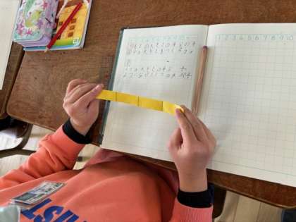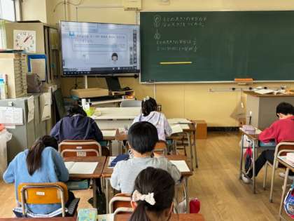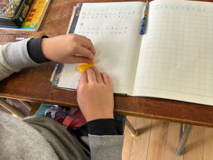 2年生は分数の学習に入りました。半分に分けると2分の1、それをまた半分にすると4分の1となることをテープを折って確認しています。これからは「半分ちょうだい」じゃなくて「2分の1ちょうだい」と言うんだよ。と楽しそうに学習しています。