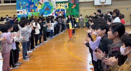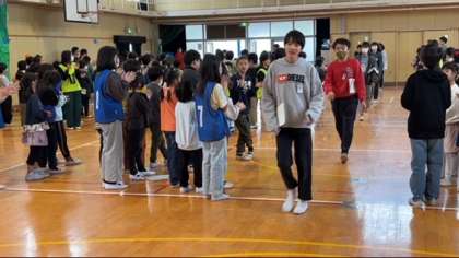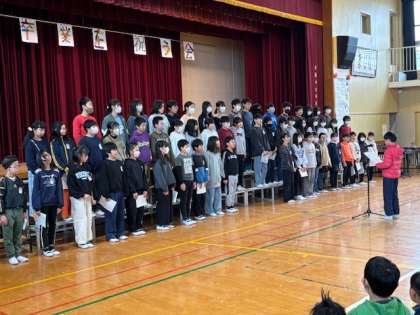 今日は体育館で6年生の卒業を祝う児童集会を行いました。児童会の児童や5年生が中心となって6年生を祝います。6年生も最初は少し緊張気味でしたが、ゲームが始まるといつもの笑顔で楽しんでいました。