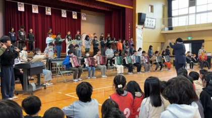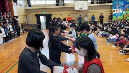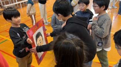 ゲームの後は、在校生からのプレゼントです。6年生の似顔絵や寄せ書きをプレゼントしました。もらった6年生も照れながらとても嬉しそうです。最後は6年生が手作りしたプレゼントを渡し、合奏や歌でお礼しました。さすがは最高学年です。先ほどまでの笑顔から、雰囲気が変わり堂々とした態度で在校生に向けて感謝を伝えていました。