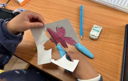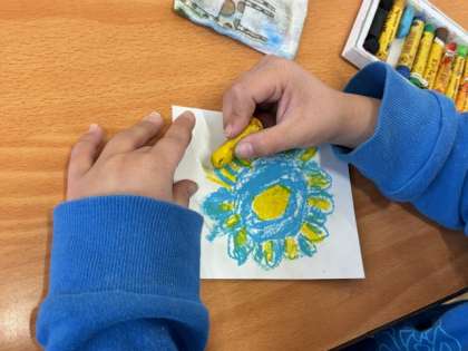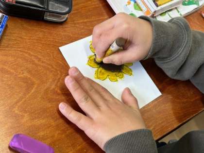 1年生は、新しく入学する新入生のために花の飾り付けを作っています。たくさんの花で教室を彩り、新入生を歓迎する準備をしています。綺麗に色をつけ、仕上げています。もうすぐお兄さん、お姉さんになります。