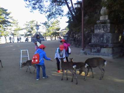 宮島の鹿たちとたわむれるグループ、お土産を買うグループといろいろですが、どのグループも協力して過ごしています。
