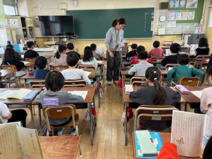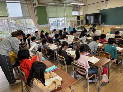 2年生は国語科で風のおくりものという物語を読んでいます。今日はみんなで声をそろえて、一文ずつ読みました。2年生になって教科書の文字数も増えています。お家でも音読してすらすら読めるようにしましょう。