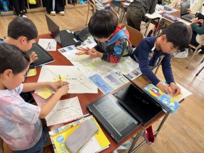 3年生は社会科で地図を調べる学習です。小学校から見てどの方角にどんなものがあるのかを探しました。地図を広げたり、タブレットPCで調べたりしました。