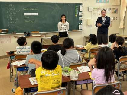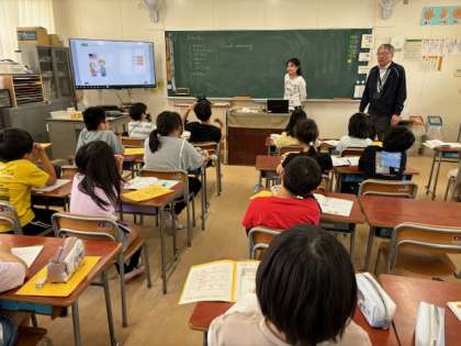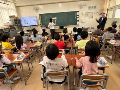 4年生は外国語活動であいさつの学習をしています。色々な国の「おはよう」「こんにちは」「おやすみ」などとあいさつを勉強しています。最後はキーワードゲームをしてみんなで元気に復唱していました。