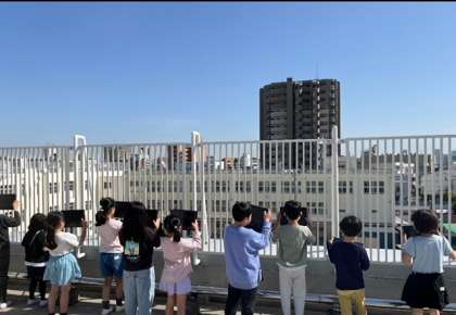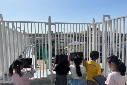 3年生は町にある建物について学習しています。前回は地図を見て学習しました。今日は、学校の屋上から地域の様子を調べました。タブレットPCで写真をとり、教室へ戻ってからも共有します。自分たちの住んでいる町を高い場所から見ることはあまりないので、子どもたちも興奮して学習していました。