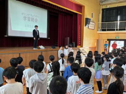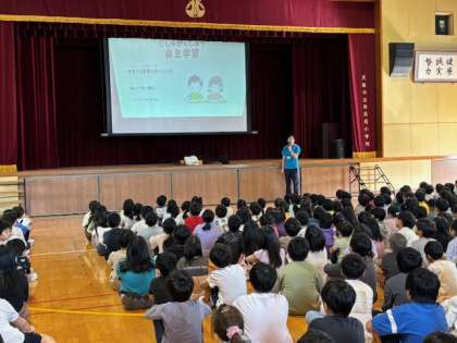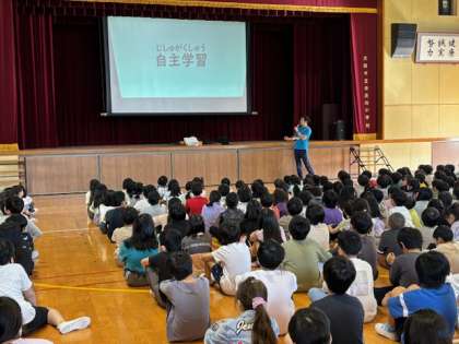 今日は月曜日なので、全校朝会の日です。今日は学習の朝会を行いました。担当の先生から自主学習についてお話がありました。学校の宿題の他に、自分の興味のあることを調べたり、授業でわかりにくかったことを復習したりします。学年によって家庭学習のめやす、家庭学習の手引きを作っています。家庭訪問で保護者の方にお渡し致しますので、お子様と相談しながら進めてください。