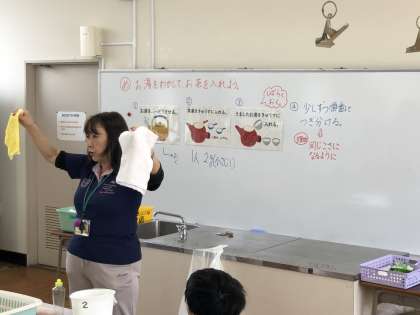 初めての調理実習ということもあり、お茶の入れ方だけでなく、ガスコンロなどの調理器具の使い方、やけどなどの事故を防ぐために安全についても学んでいました。