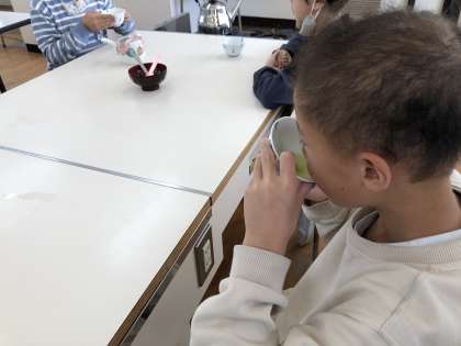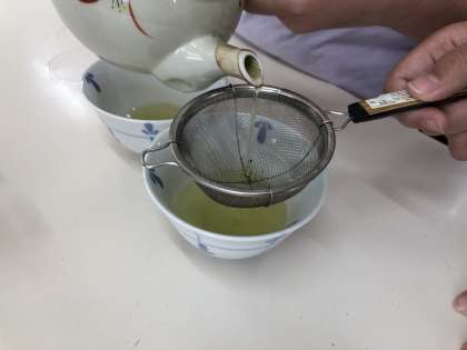 自分たちで入れたお茶は格別です。「きれいな緑やなあ」「いい匂い」と色や香りを楽しんだり、「苦みの中にも甘みがあるなあ」と深みのあるコメントをしたりしている児童もいました。