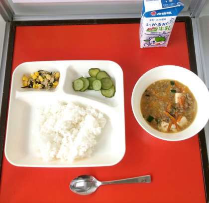 給食では、赤みそやしょうゆなどで味つけし、トウバンジャンで辛みをつけています。