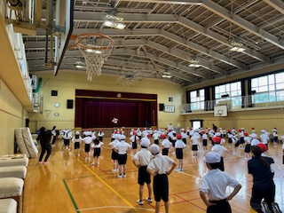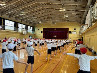 運動会まで1ヶ月を切りました。1.2年生は今日から団体演技の練習が始まりました。細かな動きは「お皿、おでこ、お皿、おでこ♪」とポーズする形を声に出しながら覚えていきます。ご家庭でも練習する様子を見て頂けたらと思います。