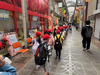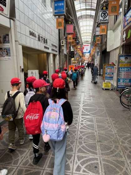 2年生は天神橋筋商店街を通り、キッズプラザ大阪に到着です。学校で交通安全について学習したので、歩き方も電車の乗り降りもバッチリです。