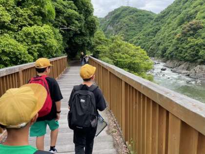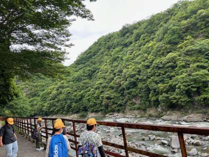 5年生は電車を乗り継ぎ武庫川渓谷に来ています。今日は大阪も涼しいですが、渓谷はさらに涼しく歩きやすいです。子どもたちはグループで福知山線の廃線跡をたどってゴールをめざします。